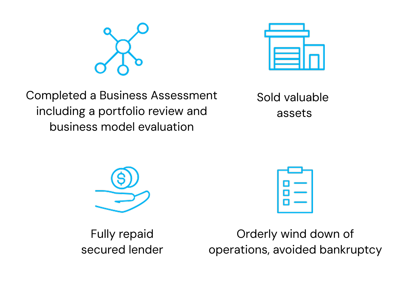 Managed the successful orderly out-of-court wind-down and sale of the business assets: